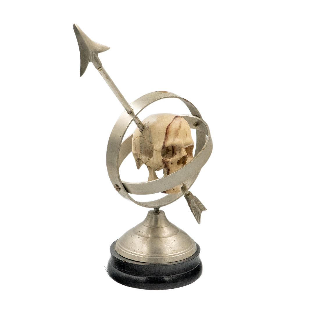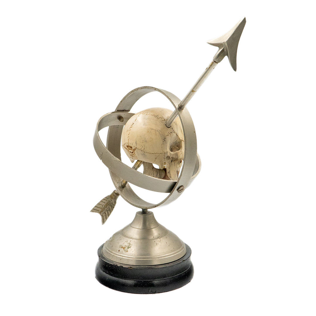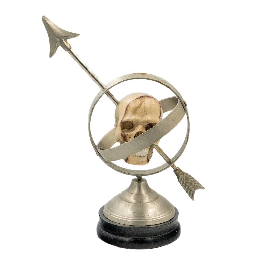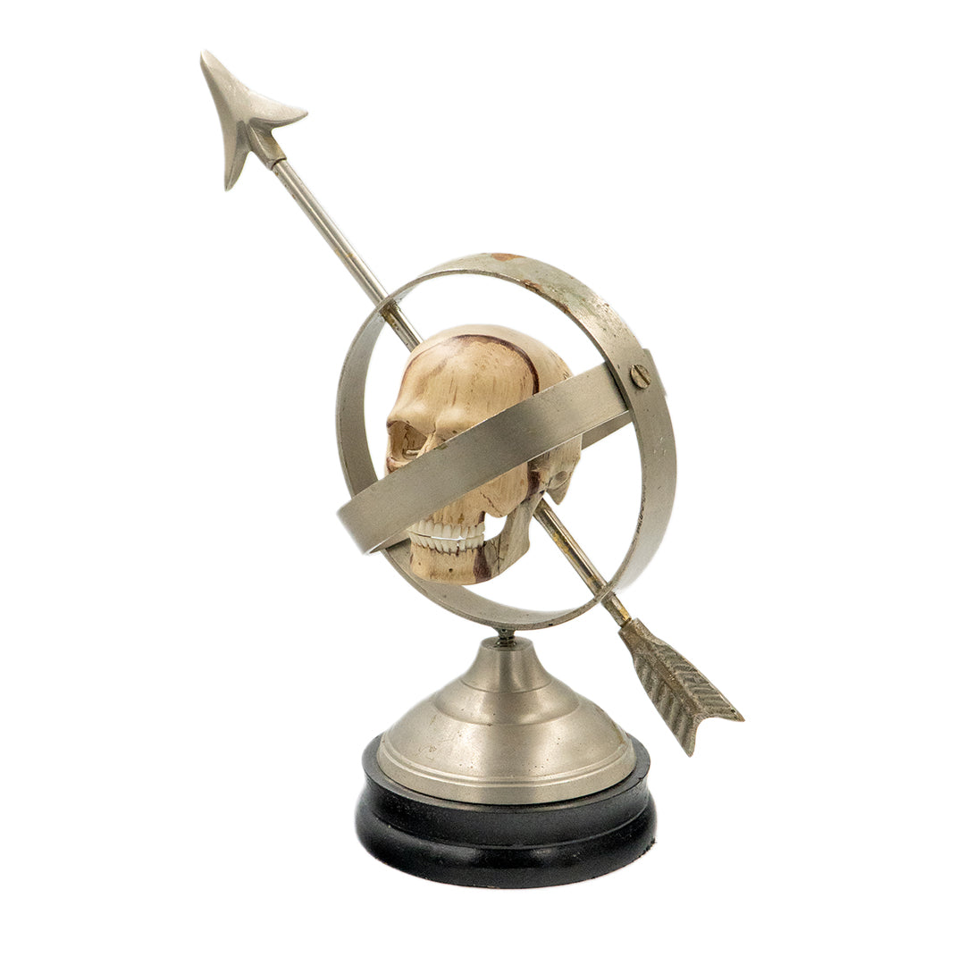 I found this old armillary sphere at a flea market in California. And by adding a hand carved wood and bone skull, its now truly a bold and unique skull sculpture.