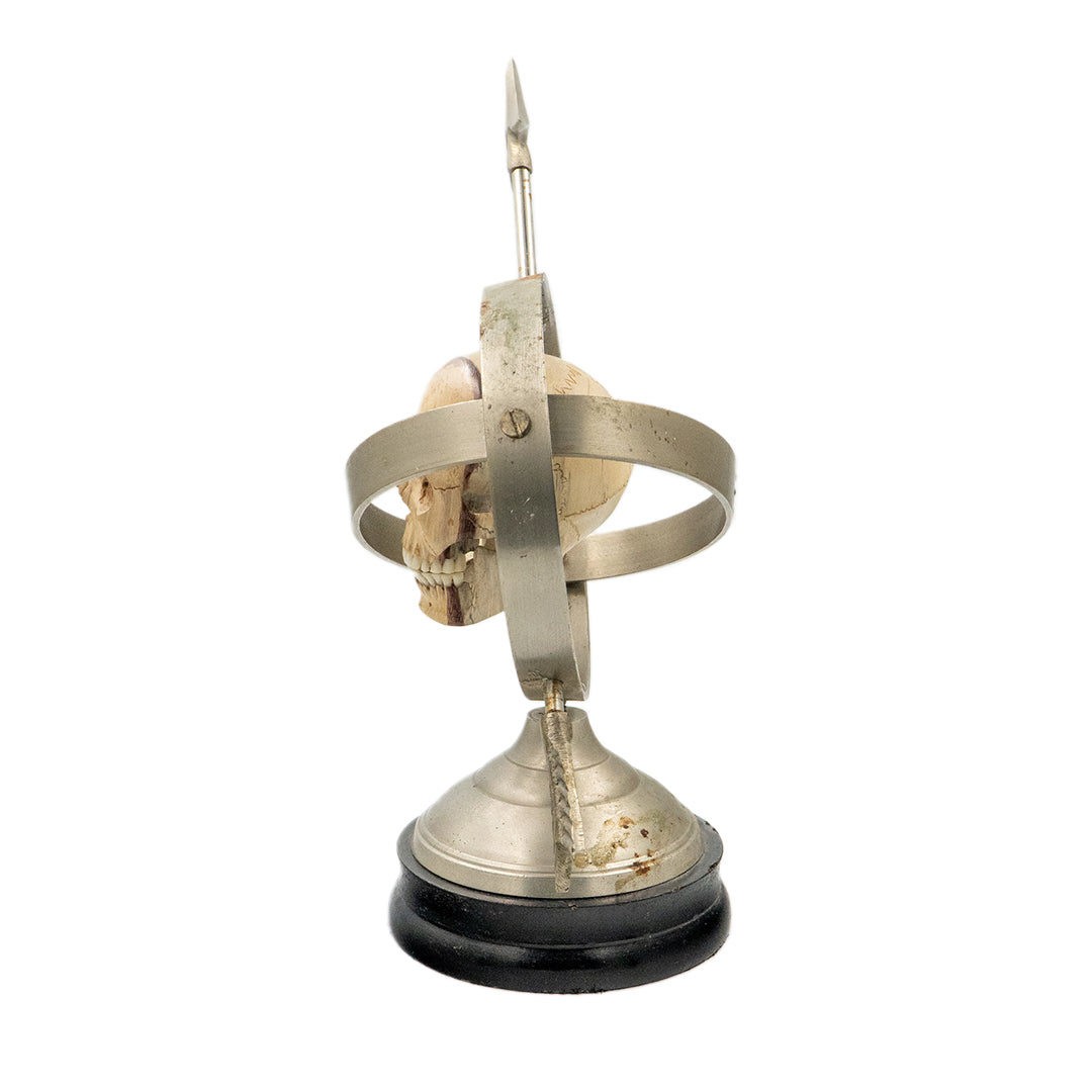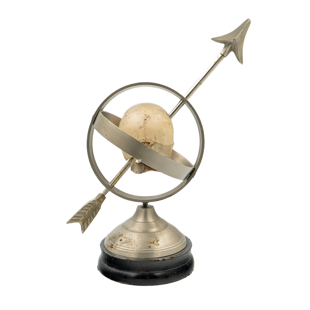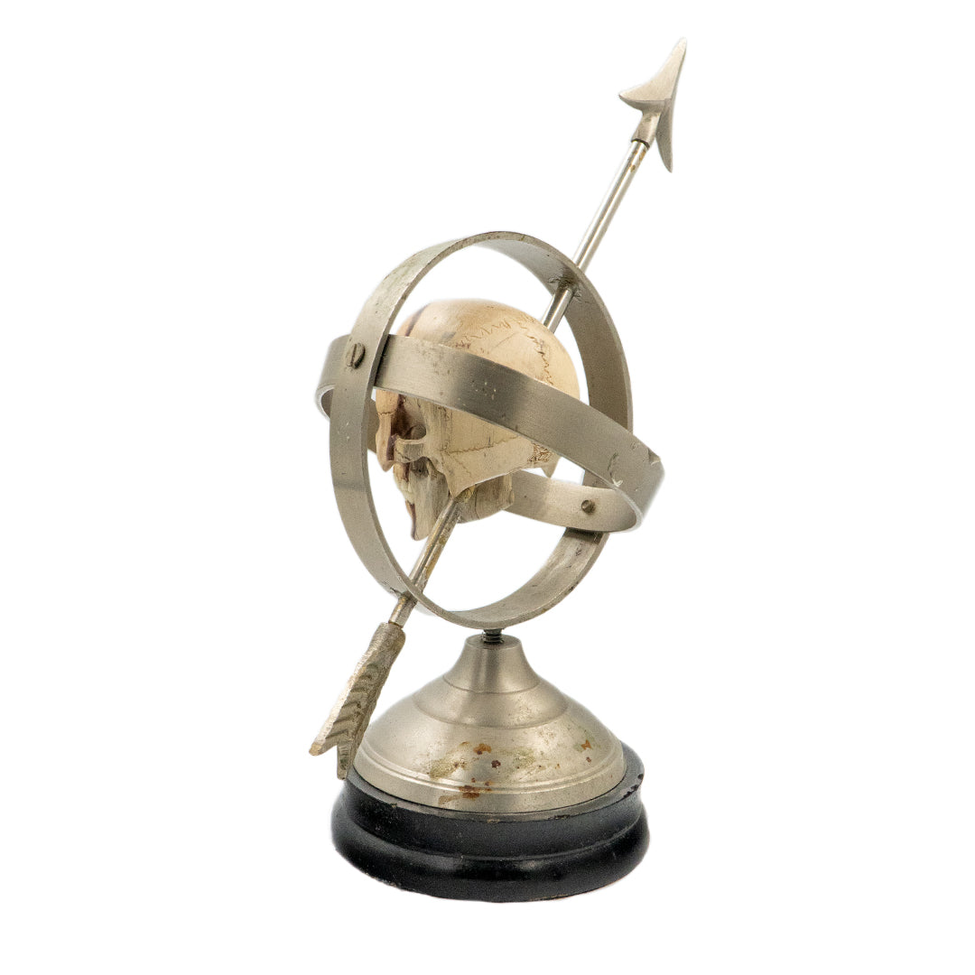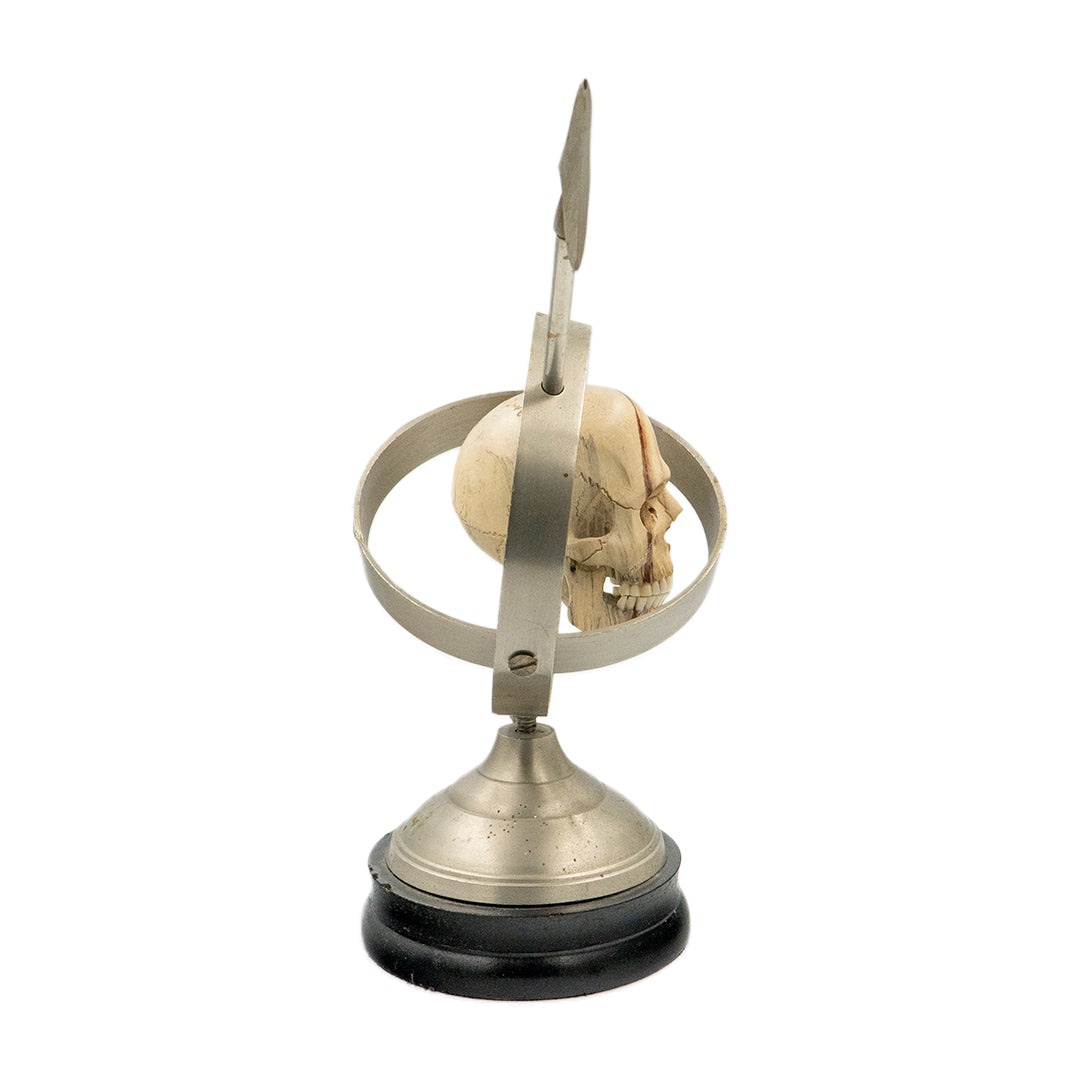 I found this old armillary sphere at a flea market in California. And by adding a hand carved wood and bone skull, its now truly a bold and unique skull sculpture.