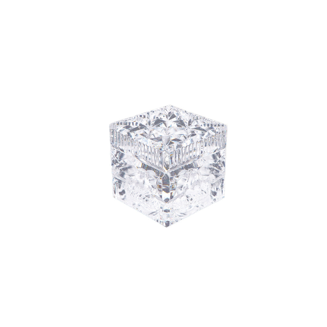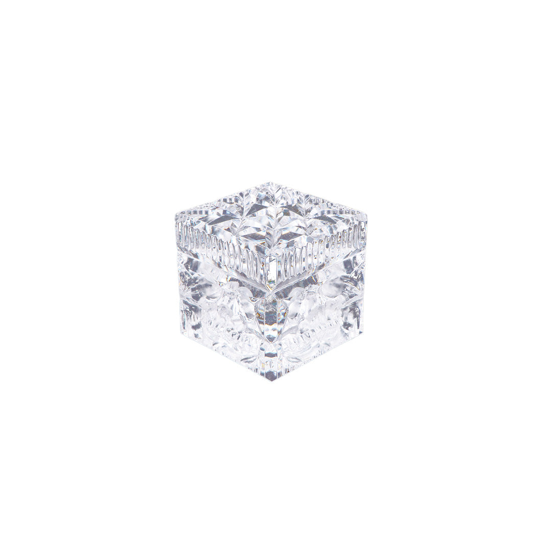 I sourced this uniquely carved lead crystal cube in California. Having made numerous face cubes of various materials, ive come to like the simple straight shape. However, as the cuts already expressed in this piece proved a challenge, it ultimately worked as the end result is spectacular.
