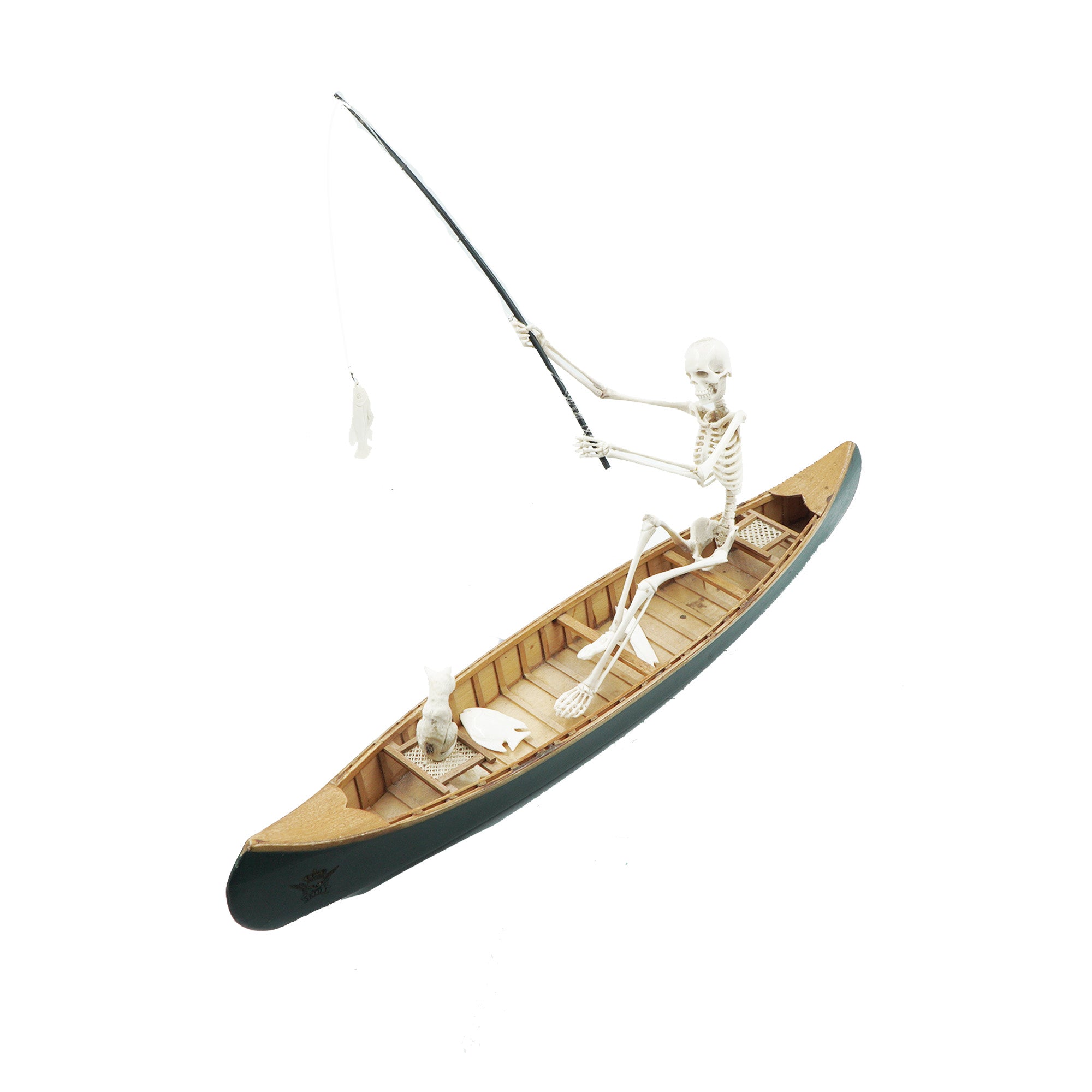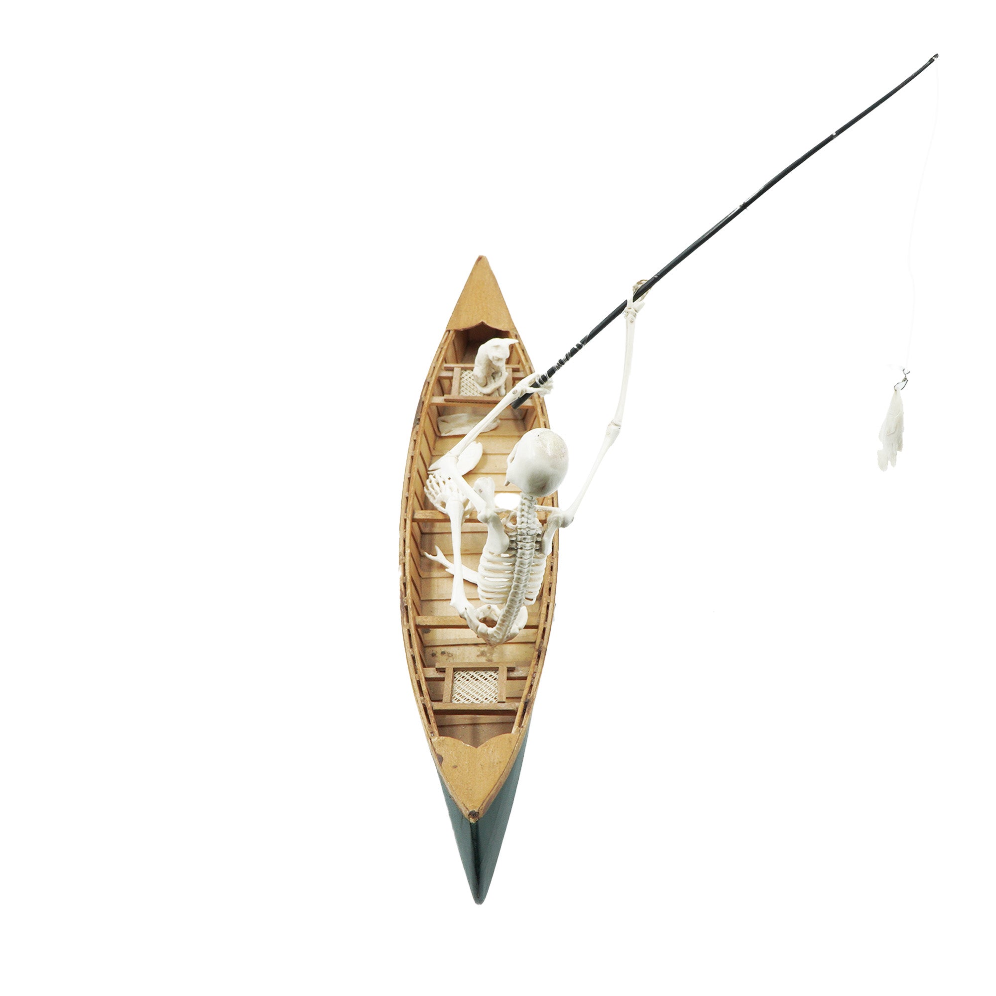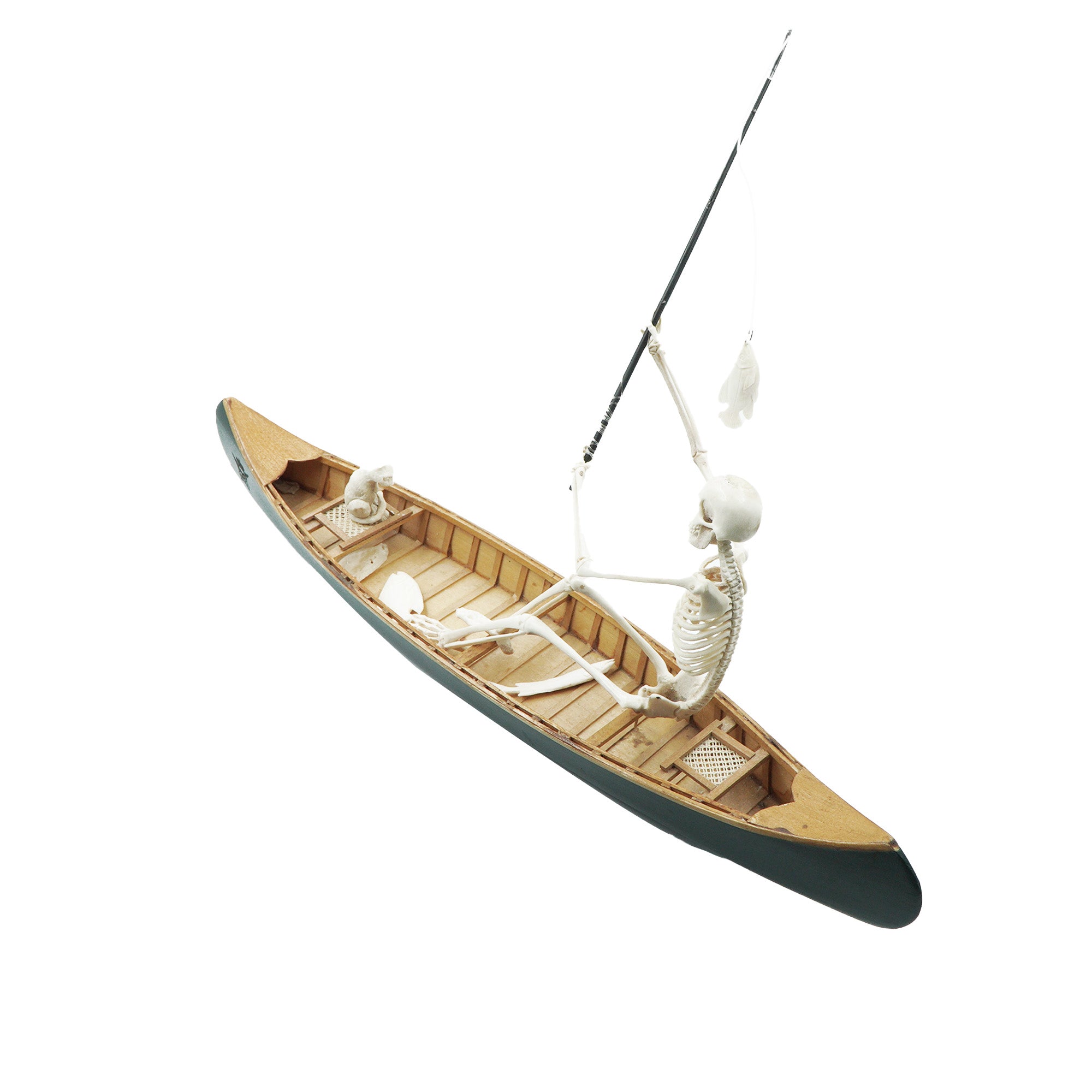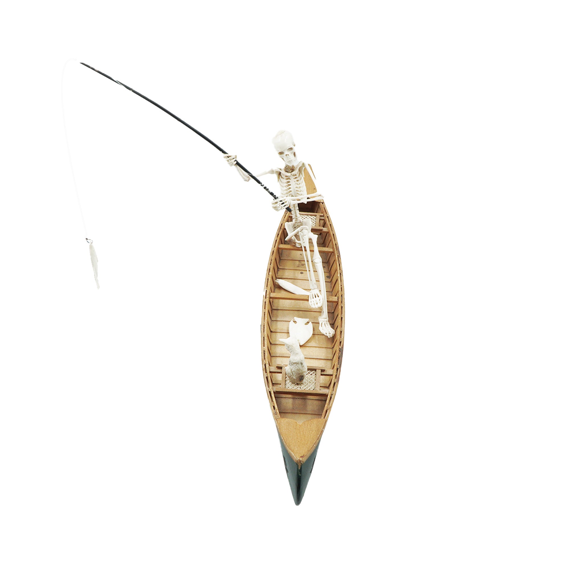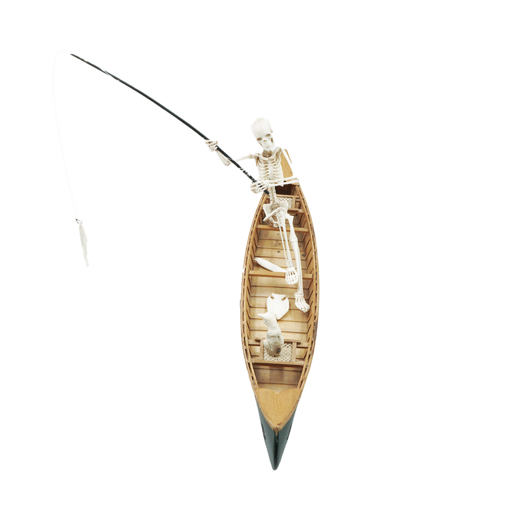 HAND CARVED BONE SKELETON, FISH, AND CAT, WITH A CARVED HORN FISHING ROD AND UPCYCLED VINTAGE BOAT