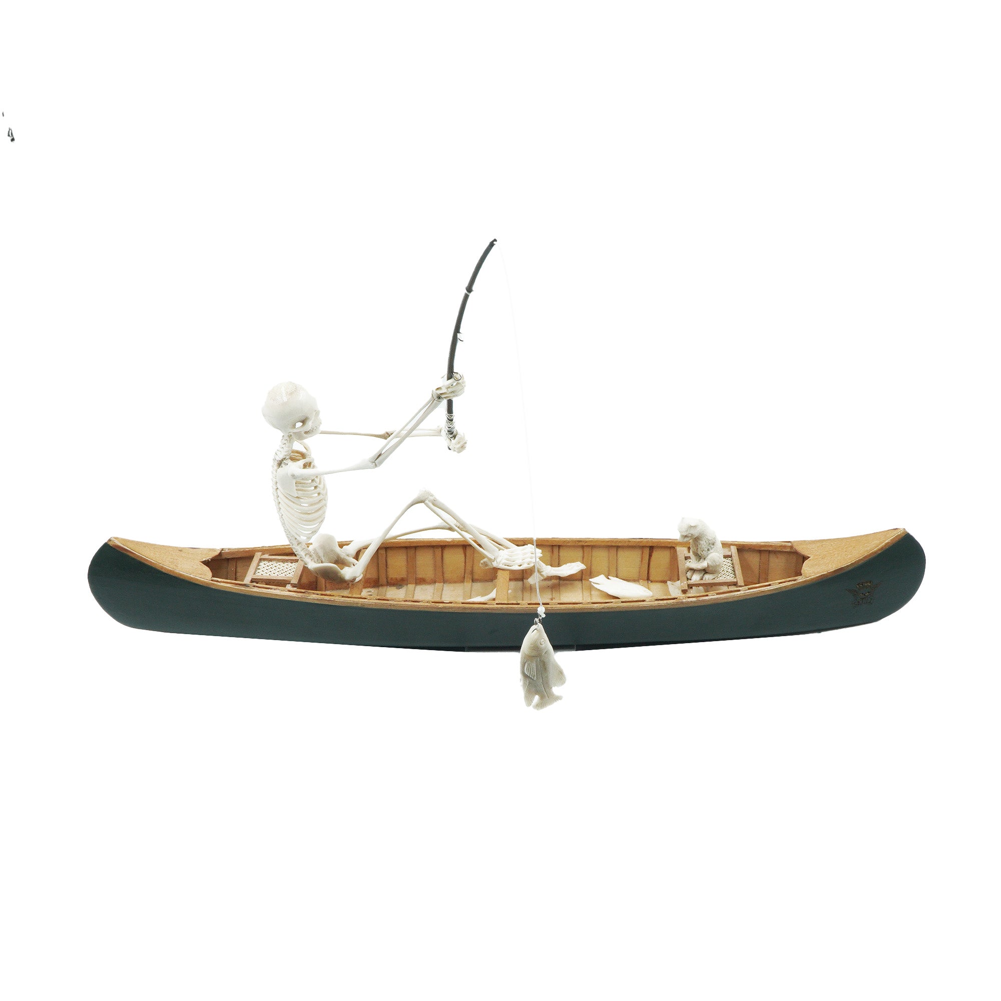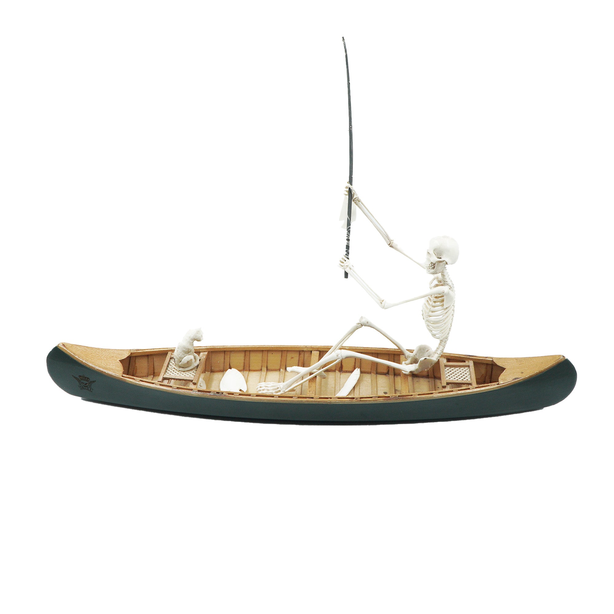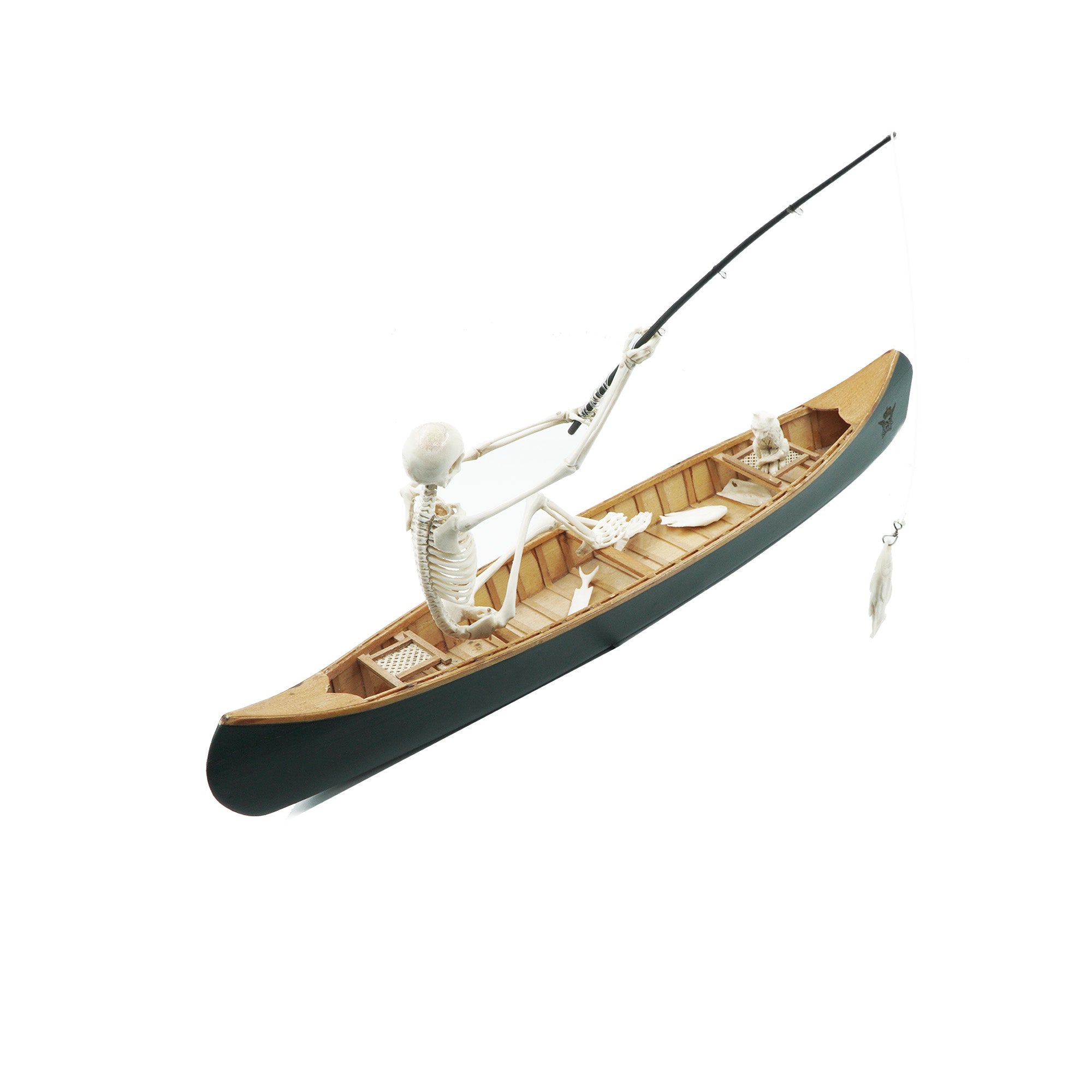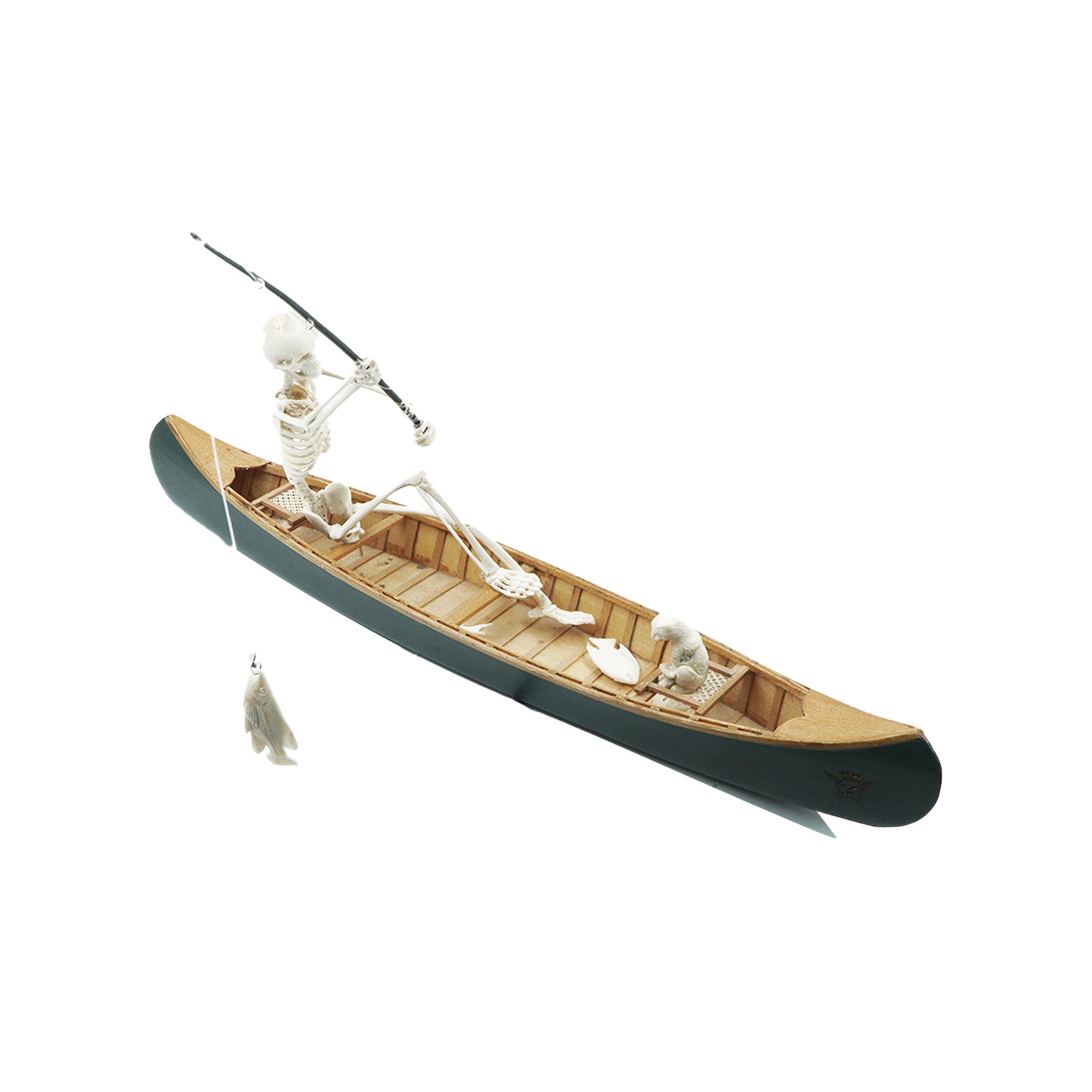 HAND CARVED BONE SKELETON, FISH, AND CAT, WITH A CARVED HORN FISHING ROD AND UPCYCLED VINTAGE BOAT