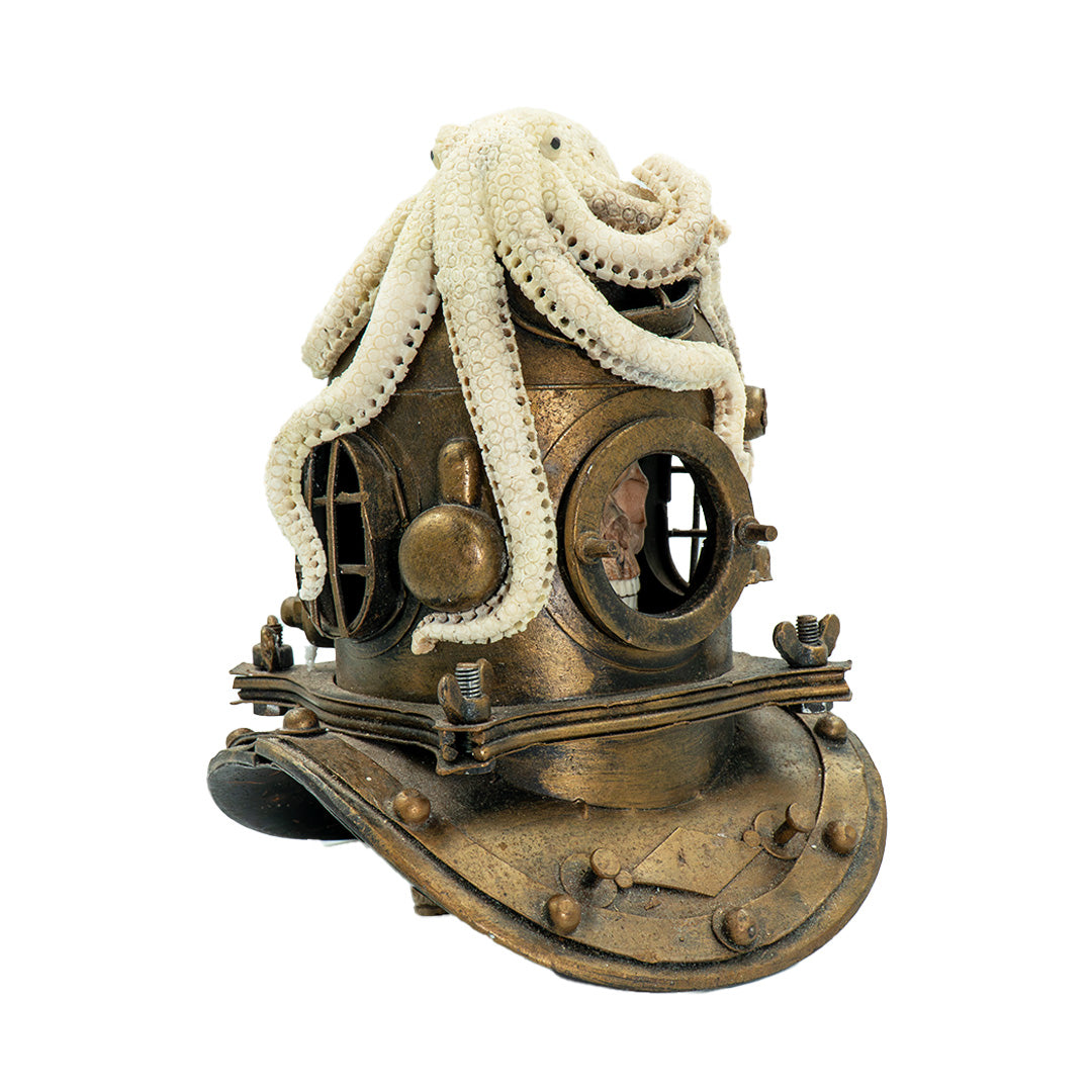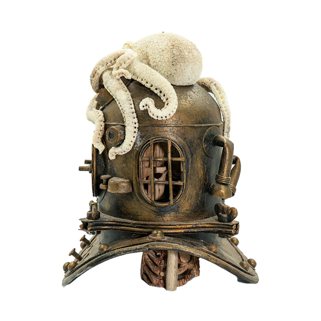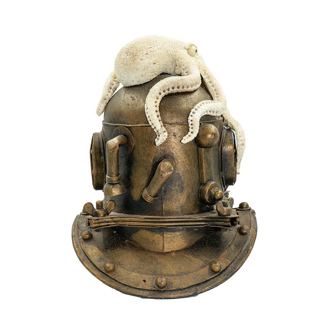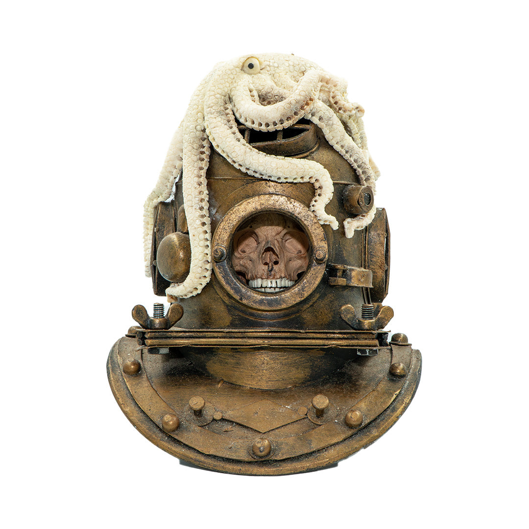HAND CARVED WOOD HALF SKELETON INSIDE A DIVING HELMET