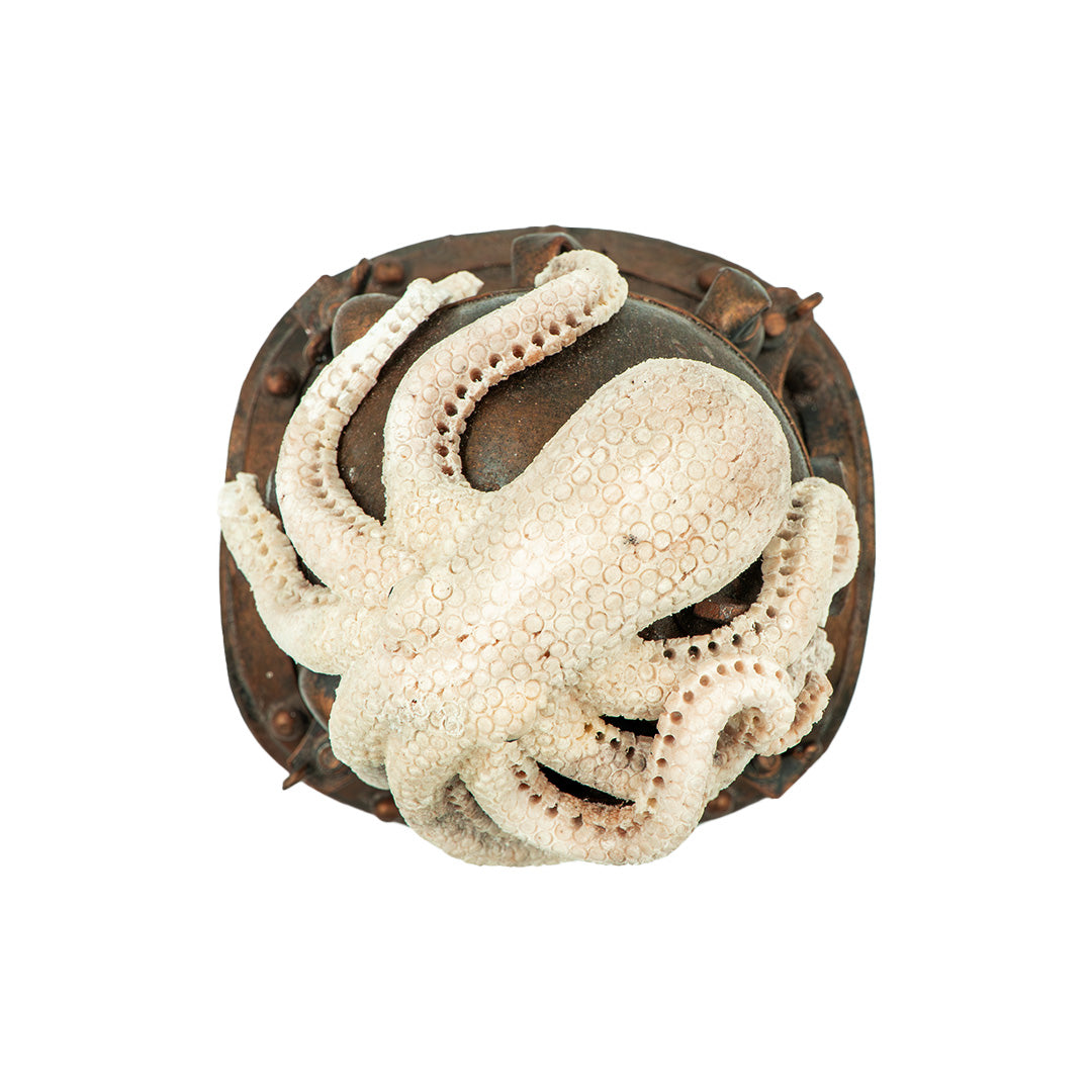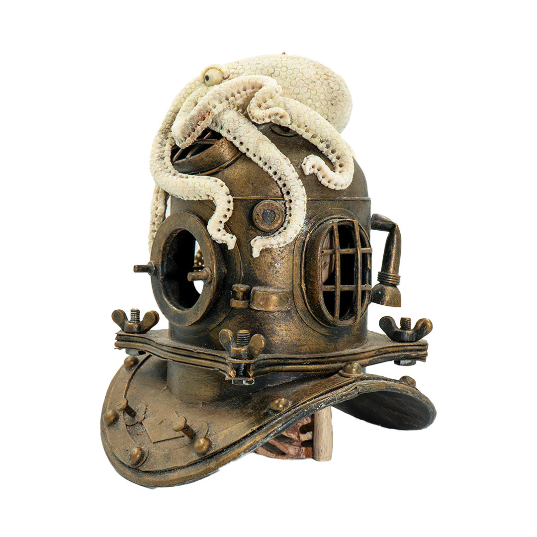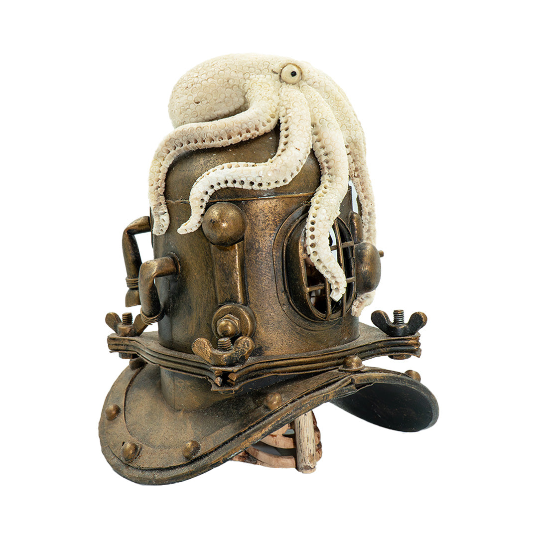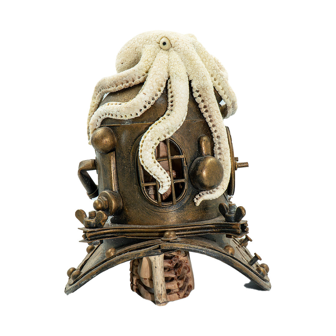 HAND CARVED WOOD HALF SKELETON INSIDE A DIVING HELMET