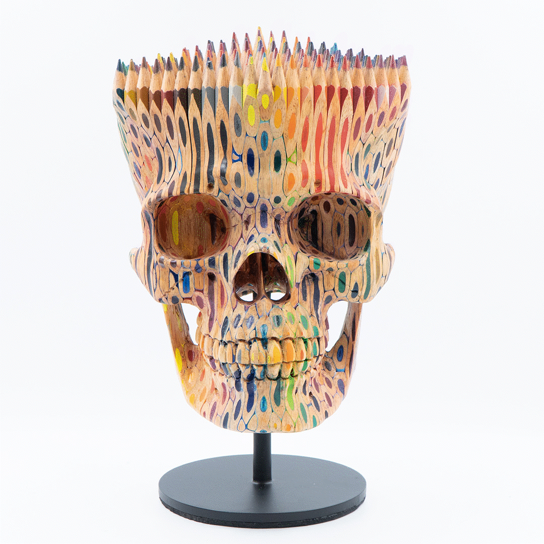 I love these color pencil skulls, which are hand carved by Bali artisans. First I glue 352 color Faber-Castell pencils together into a block, then the carve begins. These are truly beautiful pieces of art that you can own in your own home.