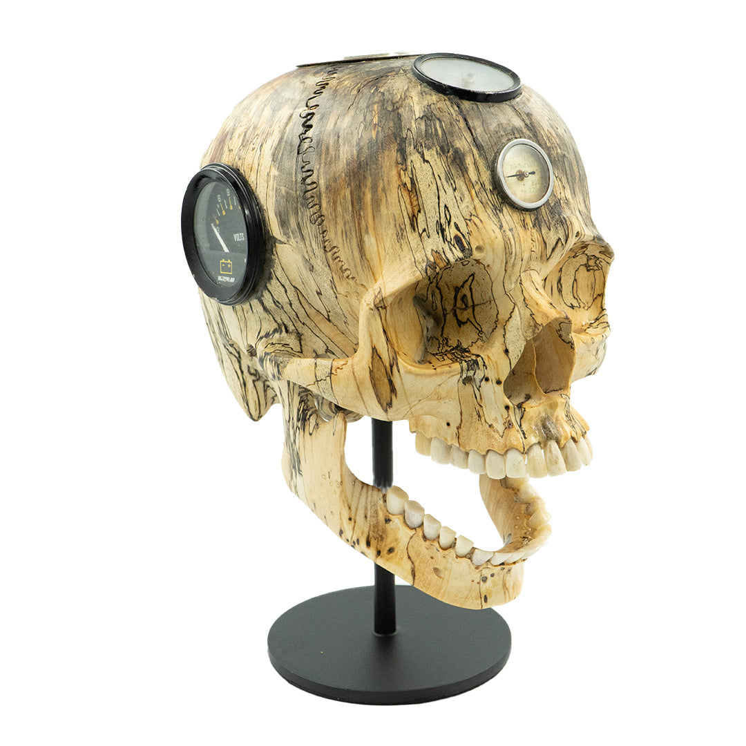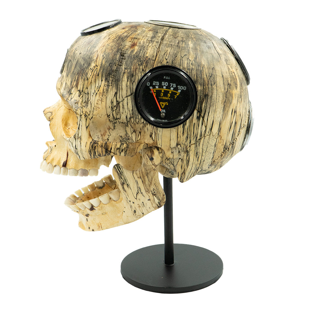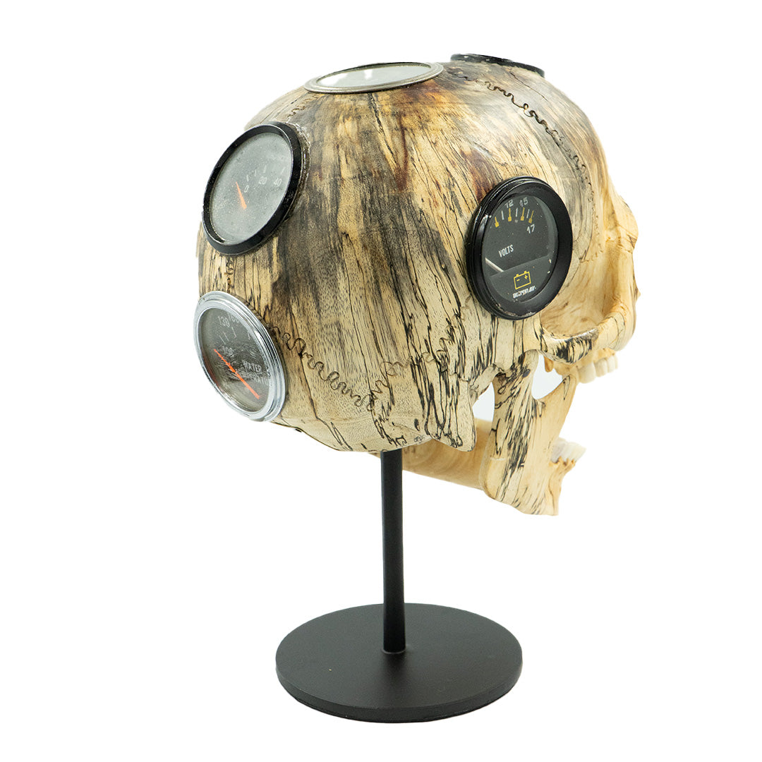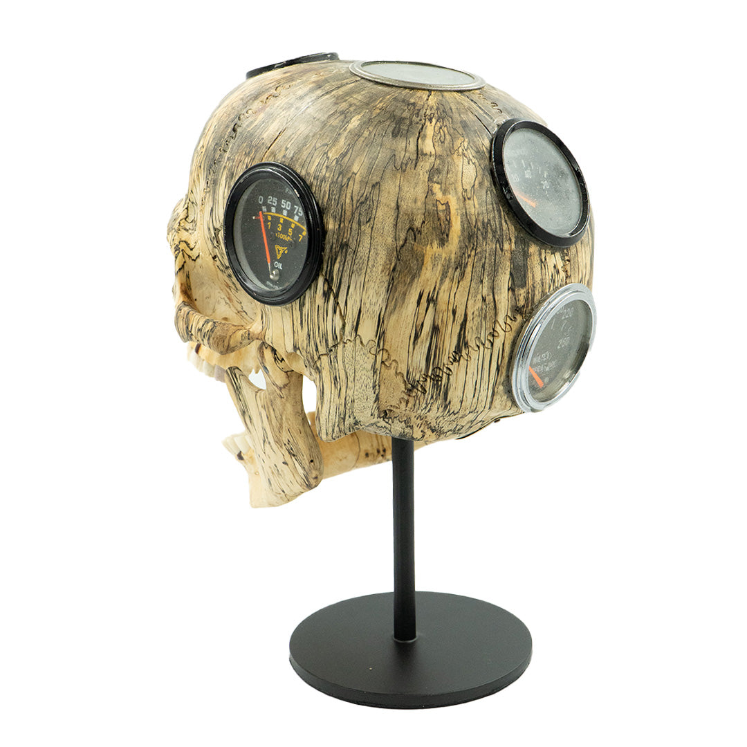 Hand carved tamarind wood and assorted dials, meters and gauges inlaid skull.