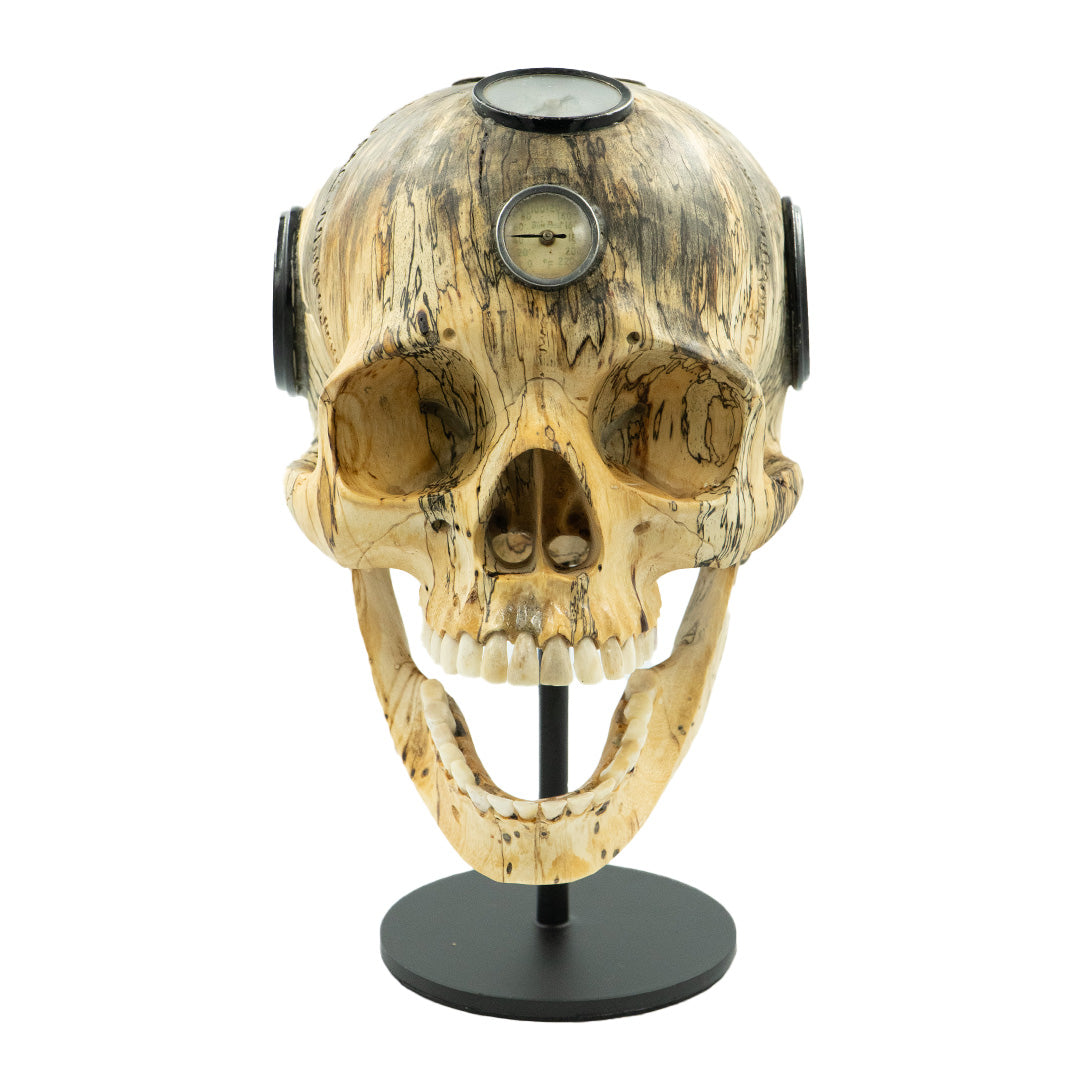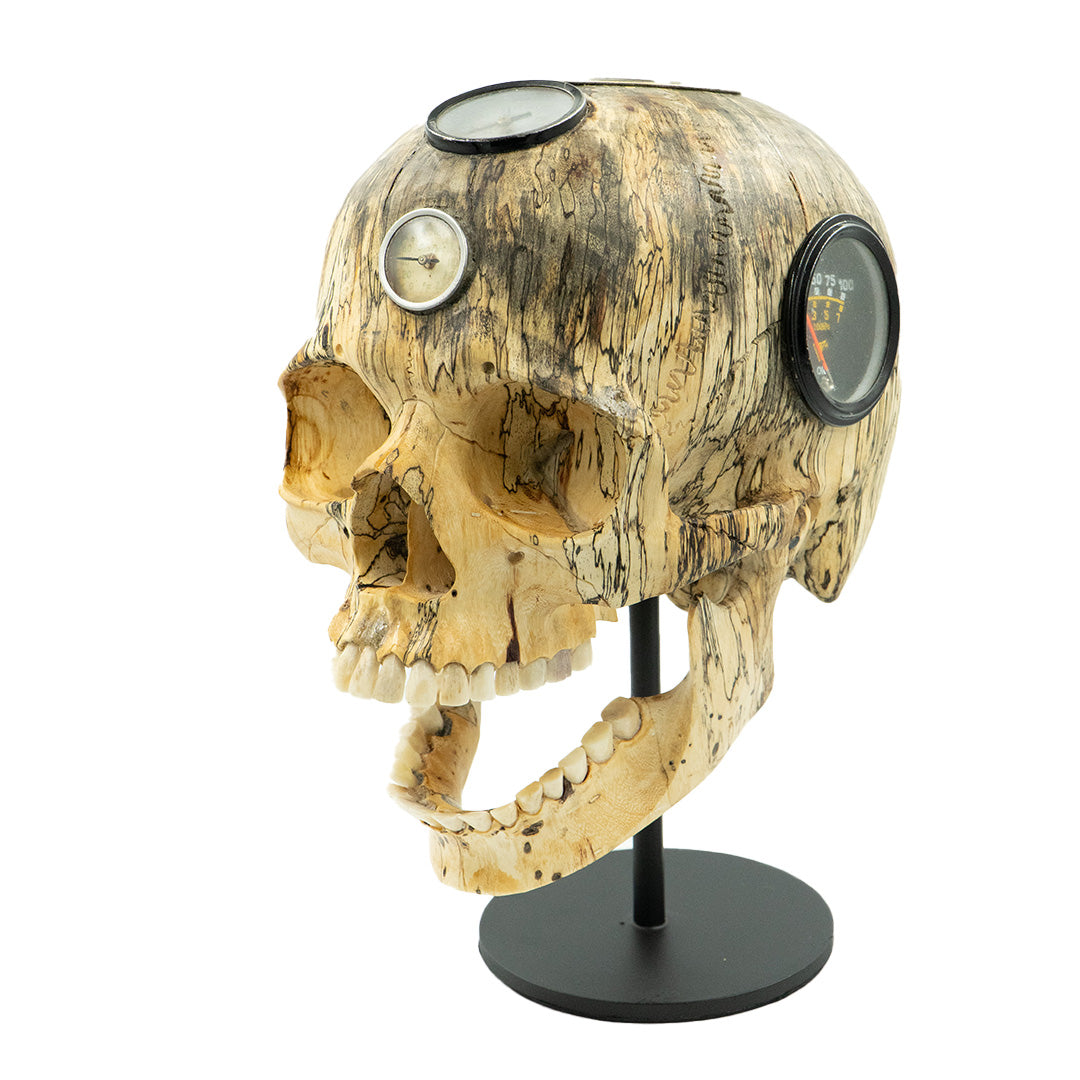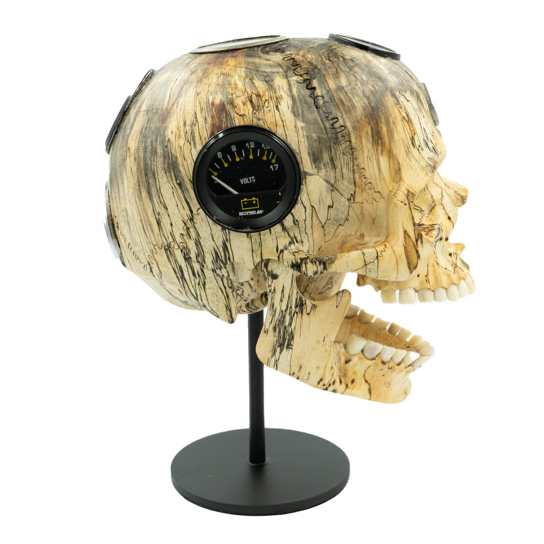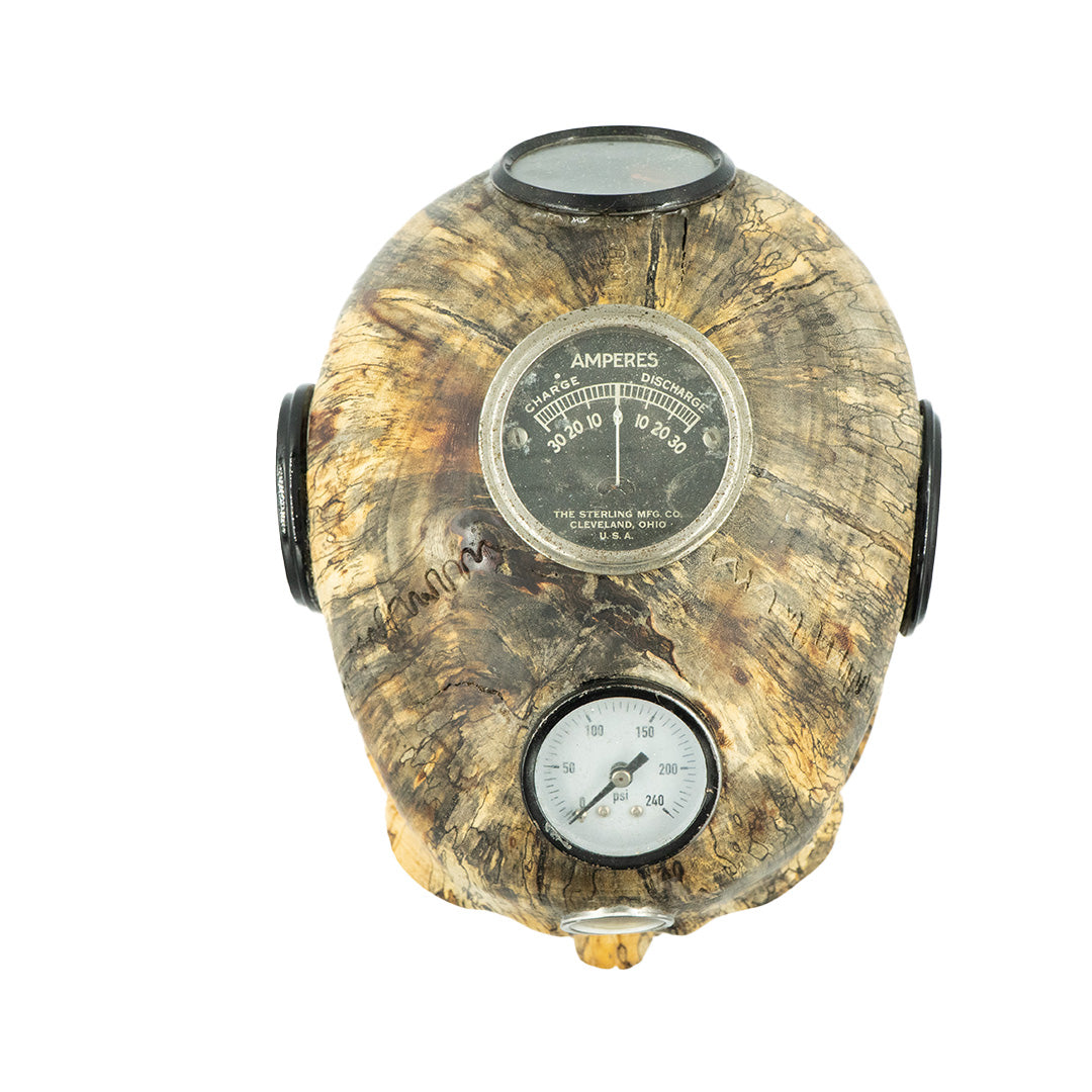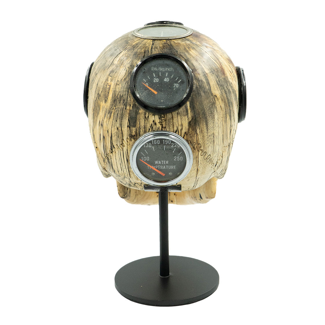 Hand carved tamarind wood and assorted dials, meters and gauges inlaid skull.